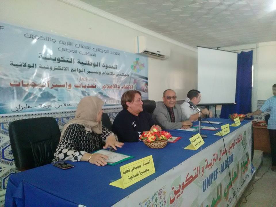 تحت شعار الاتحاد و الإعلام تحديات واستراتيجيات أفتتحت اليوم 10 أكتوبر الندوة التكوينية الوطنية للمكلفين بالإعلام و تسيير المواقع الالكترونية الولائية بثانوية بن عدة بن عودة وسط مدينة غليزان
